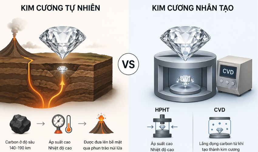 Hiện nay, có hai cách chính để tạo ra kim cương. Thứ nhất là quá trình tự nhiên, diễn ra sâu trong lòng Trái Đất trong suốt hàng triệu đến hàng tỷ năm. Tại đây, carbon chịu áp suất và nhiệt độ khắc nghiệt, sau đó được đưa lên bề mặt thông qua hoạt động địa chất. Thứ hai là quá trình nhân tạo, trong đó con người sử dụng công nghệ để mô phỏng lại môi trường tự nhiên, giúp tạo ra kim cương trong thời gian ngắn hơn, thường chỉ từ vài tuần đến vài tháng.